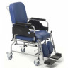 Конструкция рамы изготовлена из прочного алюминиевого сплава, складная, что обеспечивает удобство и легкость в сборке и переноске изделия. Каталка оснащена скошенными подлокотниками с мягкими накладками. Съемные подножки регулируются по высоте и отводятся в сторону для удобства посадки больного. Задние полиуретановые колеса увеличены по размеру и не требуют подкачки, что облегчает эксплуатацию кресла вне помещения. На ручках, предназначенных для сопровождающего лица, установлены тормоза. Сидение и спинка сделаны из прочной дышащей ткани.